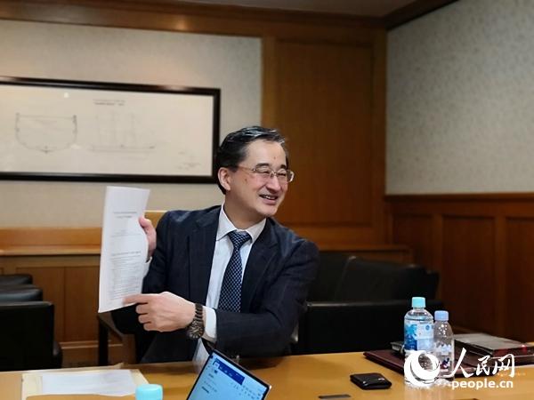 圖為日本慶應(yīng)大學(xué)經(jīng)濟(jì)學(xué)教授木村福成接受三國記者聯(lián)合采訪。