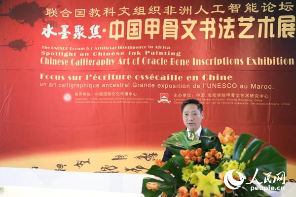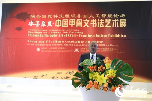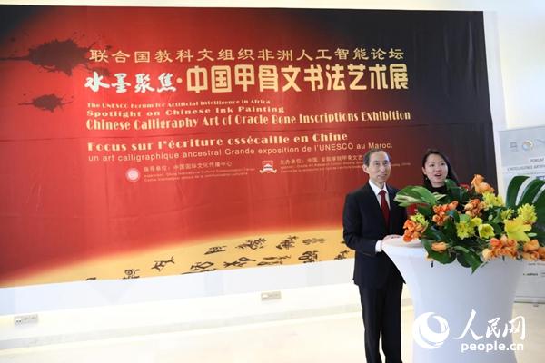 人民網(wǎng)訊 摩洛哥當(dāng)?shù)貢r間12月11日,由中國國際文化傳播中心指導(dǎo),安陽學(xué)院主辦的“水墨聚焦·中國甲骨文書法藝術(shù)展”在摩洛哥馬拉喀什聯(lián)合國教科文組織召開的非洲人工智能論壇會場舉行開幕式。聯(lián)合國教科文組織總干事奧德蕾·阿祖萊與190多個國家的代表參觀書法展。