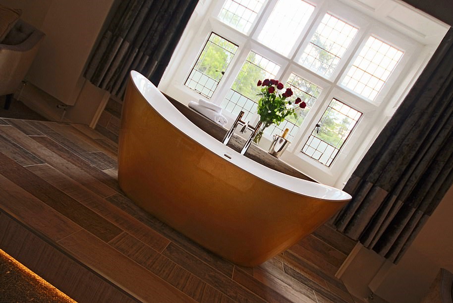 北威爾士Caer Rhun Hall酒店房間的銅浴缸。
