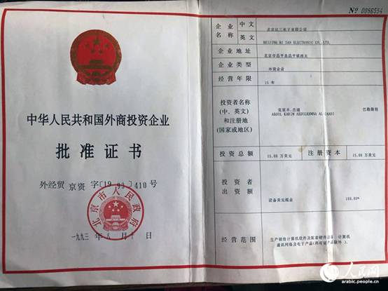 1993年,克里木拿到的外商投資企業(yè)批準(zhǔn)證書,他投資15萬(wàn)美元,注冊(cè)了一家主營(yíng)計(jì)算機(jī)軟硬件的外資企業(yè)(人民網(wǎng)記者曾書柔攝)