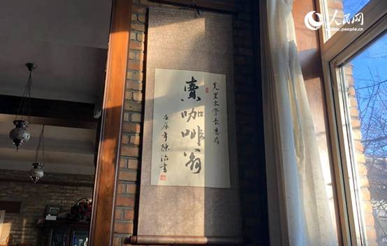 克里木家里掛著的一幅寫有“賣咖啡翁”的書法,這是他的中國(guó)朋友贈(zèng)予他的作品(人民網(wǎng)記者曾書柔攝)