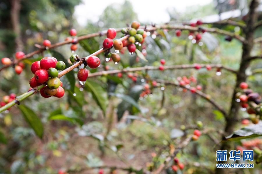 在埃塞俄比亞塔普咖啡產(chǎn)區(qū)的安得拉赫沙卡咖啡莊園,咖啡樹枝頭掛滿咖啡果(2018年12月8日攝)。12月正是莊園采摘處理咖啡的高峰期。新華社記者 張宇 攝