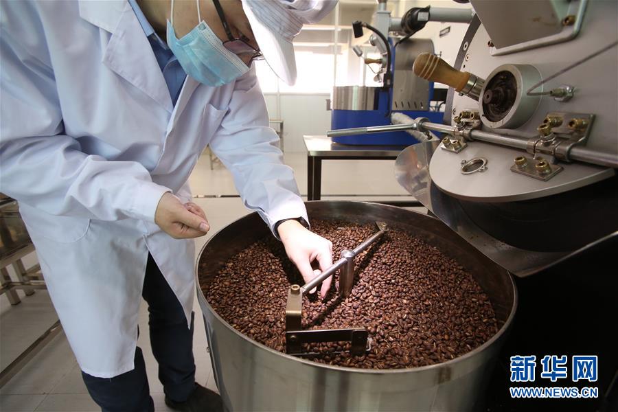 在廣東省東莞市,翹鼻子咖啡工廠創(chuàng)始人吳森勝烘焙來自埃塞俄比亞的咖啡豆(2018年12月6日攝)。新華社記者 程麗 攝