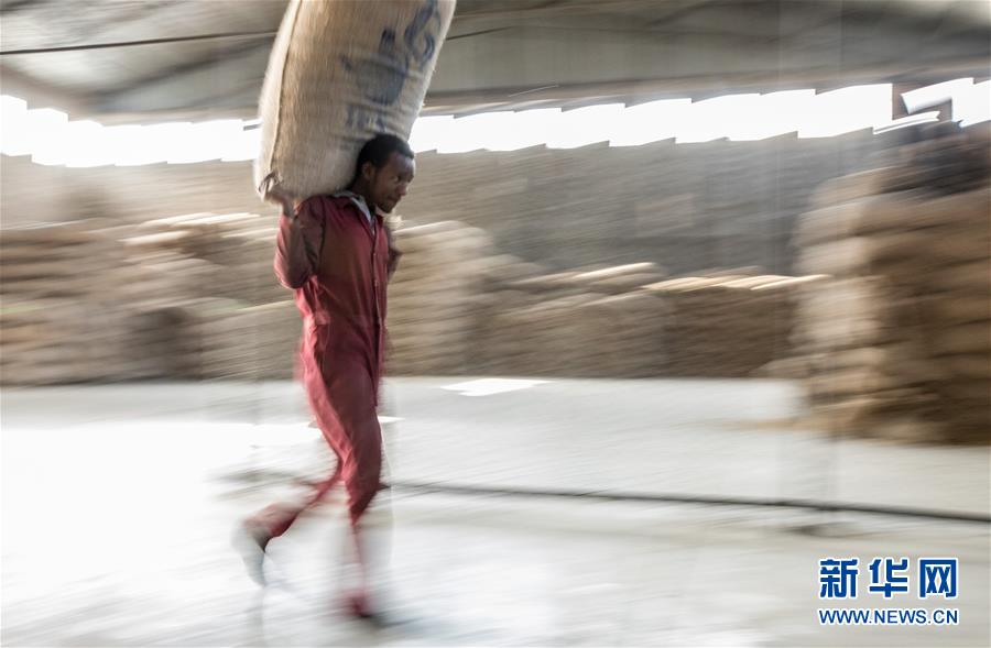 在埃塞俄比亞首都亞的斯亞貝巴SMS Plc公司的咖啡處理廠,工人搬運(yùn)咖啡豆(2018年12月12日攝)。新華社記者 張宇 攝