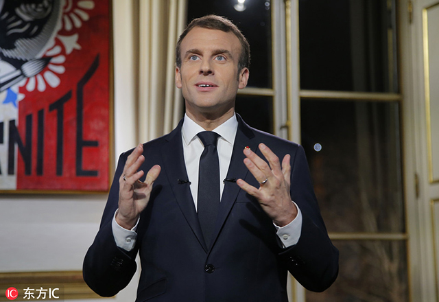 法國(guó)總統(tǒng)馬克龍?jiān)谛履昵耙雇ㄟ^電視錄制了2019年新年致辭。