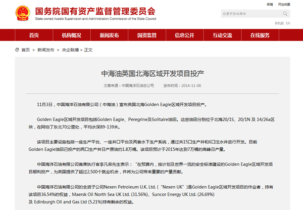 中國海洋石油有限公司的全資子公司Nexen Petroleum U.K. Ltd. (“Nexen UK”)是Golden Eagle區(qū)域開發(fā)項目的作業(yè)者,持有該項目36.54%的權(quán)益,Maersk Oil North Sea UK Ltd. (31.56%)、Suncor Energy UK Ltd. (26.69%)及 Edinburgh Oil and Gas Ltd (5.21%)持有剩余的權(quán)益。