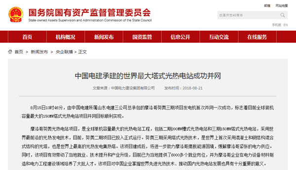 中國電建承建的世界最大塔式光熱電站成功并網(wǎng)