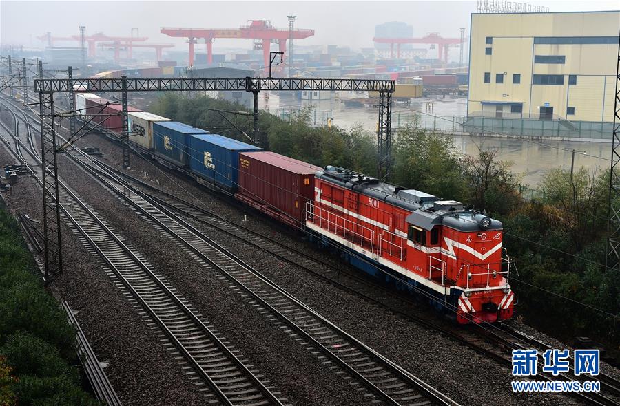 1月4日,2019年首趟中歐班列(義烏至馬德里)從義烏鐵路口岸出發(fā)。 當(dāng)日,滿載著90標(biāo)箱商品的2019年首趟中歐班列(義烏至馬德里)從浙江義烏鐵路口岸出發(fā)。 新華社發(fā)(呂斌 攝)