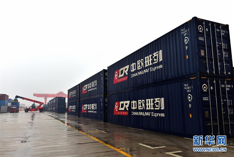 1月4日,在浙江義烏鐵路口岸,工作人員將完成查驗(yàn)的集裝箱起吊至中歐班列上。 當(dāng)日,滿載著90標(biāo)箱商品的2019年首趟中歐班列(義烏至馬德里)從浙江義烏鐵路口岸出發(fā)。 新華社發(fā)(呂斌 攝)