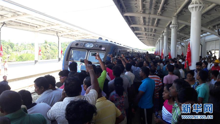1月6日,在斯里蘭卡南部城市貝利亞塔,人們拍攝駛?cè)胲囌镜幕疖嚒?由中國(guó)企業(yè)承建的斯里蘭卡南部鐵路一期項(xiàng)目6日在斯南部城市貝利亞塔舉行試通車儀式。該項(xiàng)目于2013年8月開(kāi)工,一期主體工程建設(shè)里程全長(zhǎng)26.75公里,連接斯南部城市貝利亞塔和馬特勒,設(shè)計(jì)時(shí)速120公里。 新華社發(fā)(加揚(yáng)·薩米拉 攝)