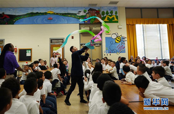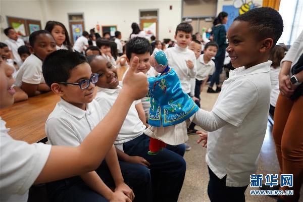 福建漳州布袋木偶戲傳承人陳黎暉熟練地“擺弄”著他最拿手的丑角木偶,近200名美國小學(xué)生看得津津有味,當他用手指操控木偶做出伸脖子、脫帽、踢腿等動作時,現(xiàn)場爆發(fā)出陣陣笑聲。