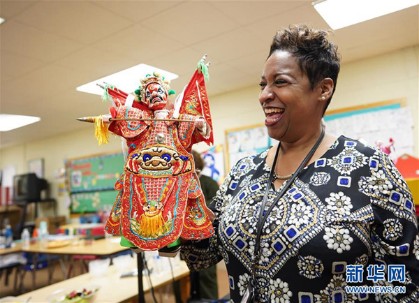 3月20日,在美國馬里蘭州喬治王子縣的潘布蘭奇小學(xué),福建漳州布袋木偶戲傳承人陳黎暉(中)表演木偶戲。新華社記者 熊茂伶 攝