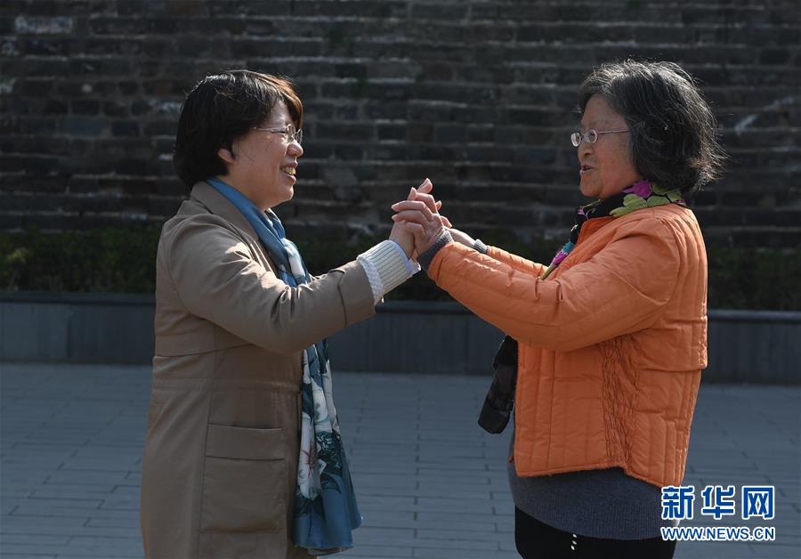 在南京一處公園,吉川淳子(左)和南京市民張阿姨一起跳廣場舞(3月15日攝)。 新華社記者 邱冰清 攝