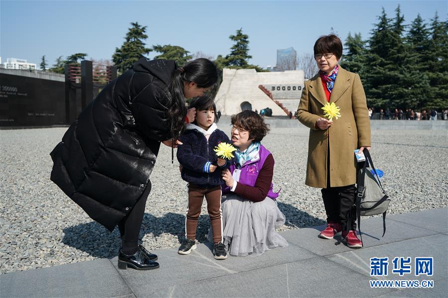 在侵華日軍南京大屠殺遇難同胞紀(jì)念館,吉川淳子(右二)在向參觀者講解(3月7日攝)。 新華社記者 邱冰清 攝