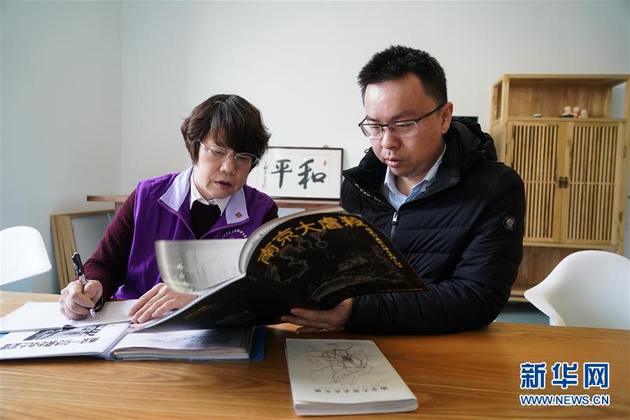 在侵華日軍南京大屠殺遇難同胞紀(jì)念館,吉川淳子(左)在和館員蘆鵬交流(3月7日攝)。 新華社記者 季春鵬 攝