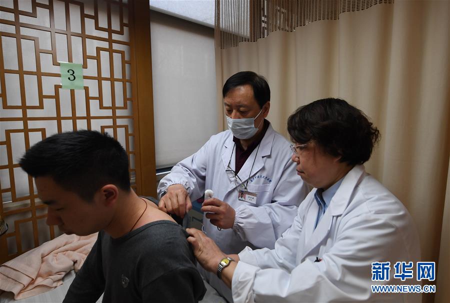 在南京中醫(yī)藥大學(xué)國(guó)醫(yī)堂,吉川淳子(右)在向南京中醫(yī)藥大學(xué)劉農(nóng)虞教授學(xué)習(xí)筋針針灸(3月15日攝)。志愿者之外,吉川淳子還有一個(gè)身份——南京中醫(yī)藥大學(xué)博士生。 新華社記者 季春鵬 攝