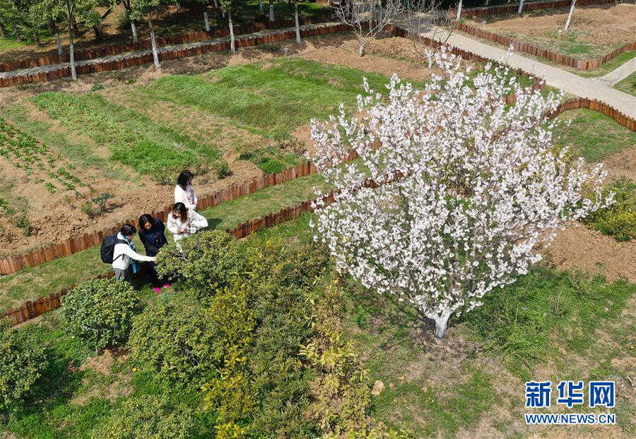 在南京中醫(yī)藥大學(xué),藥學(xué)院教師束曉云(左二)在教吉川淳子(左一)等辨認(rèn)藥用植物(3月15日無人機(jī)拍攝)。志愿者之外,吉川淳子還有一個(gè)身份——南京中醫(yī)藥大學(xué)博士生。新華社記者 季春鵬 攝