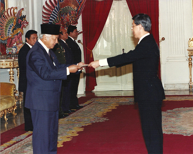 1995年9月27日,周剛大使向印尼總統(tǒng)蘇哈托遞交國書(圖片由受訪者提供)