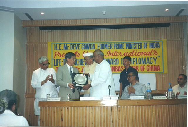 2001年6月14日,印度前總理德夫高達代表印度國際團結(jié)基金會授予周剛大使“終身外交成就獎。(圖片由受訪者提供)