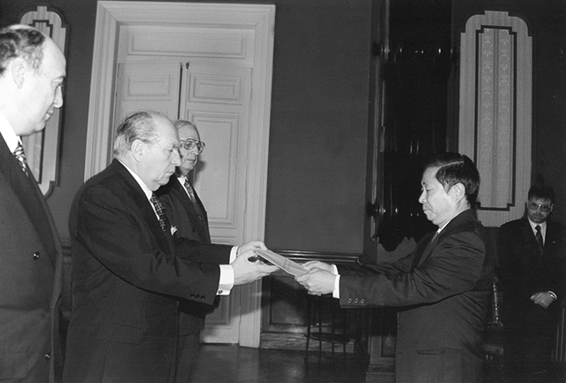 1996年,湯銘新向?yàn)趵缈偨y(tǒng)桑吉內(nèi)蒂遞交國書。