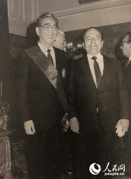 1990年7月25日,秘魯眾議長(zhǎng)阿爾瓦拉多(右)向朱祥忠大使授予“太陽(yáng)大十字”勛章后合影(資料圖)。