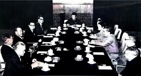資料圖片:1972年9月,周恩來總理(桌右側(cè)正中)在人民大會(huì)堂與日本首相田中角榮會(huì)談,桌末端為廉正保