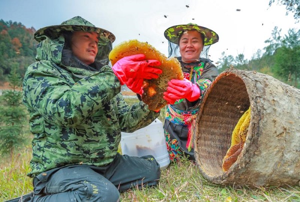 習近平總書記的到來,讓龍先蘭確信家鄉(xiāng)將會和以前不一樣。于是他辭去工作,買了一張回鄉(xiāng)的車票。在十八洞村精準脫貧工作隊的幫助下,龍先蘭開始學習養(yǎng)蜂技術。“他們幫助我試養(yǎng)了4箱蜜蜂!饼埾忍m回憶,“當年便收入5000多元”。