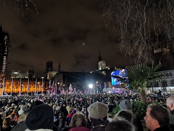 2020年1月31日晚,人群聚集在英國議會廣場慶祝脫歐。白天行攝