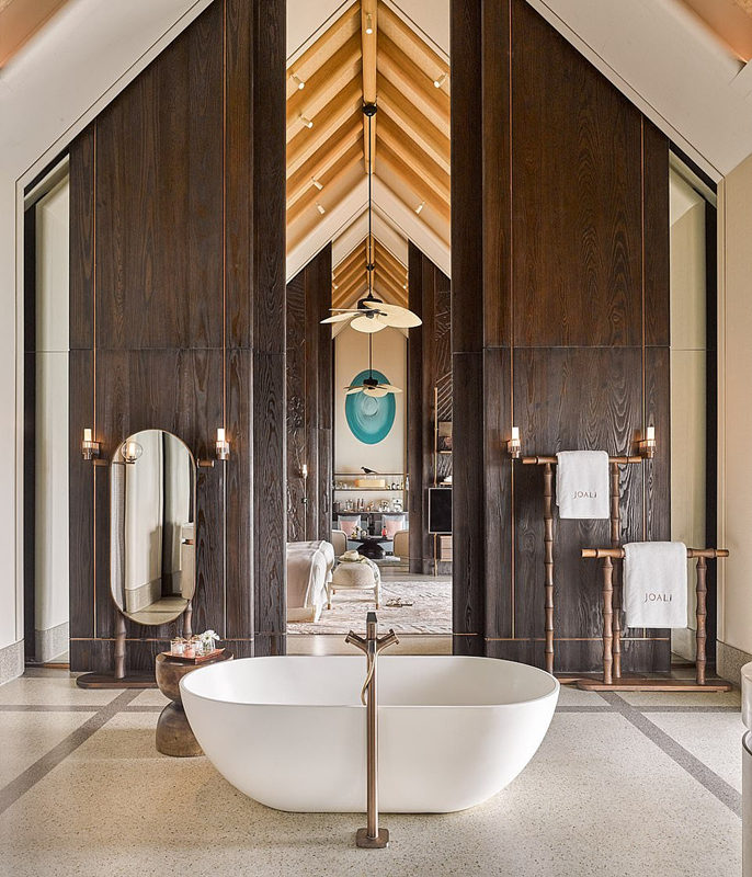 Joali度假勝地的寬大浴室,配備可容納兩個人的大型獨立浴缸。