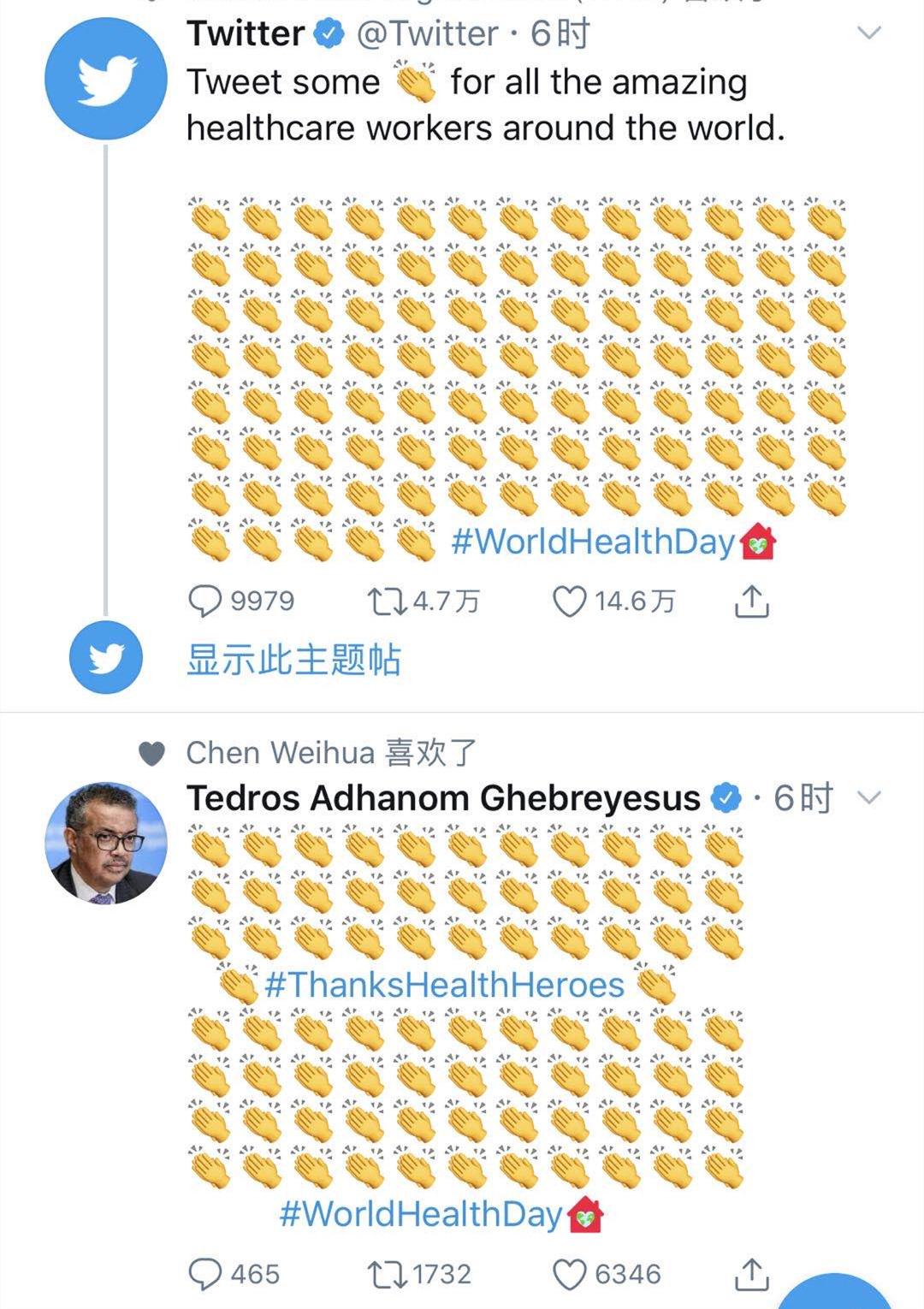4月7日是世界衛(wèi)生日。世衛(wèi)組織總干事譚德塞在推特上貼出了一張圖片,由數(shù)十個鼓掌的表情組成,向衛(wèi)生系統(tǒng)的英雄們致敬。隨后,推特官方(Twitter)呼吁用戶發(fā)推,為全球所有了不起的醫(yī)護工作者鼓掌。