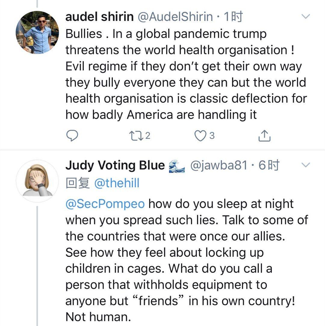 蓬佩奧的強行“貼金”迅速被輿論揭底。西方社交媒體用戶諷刺道:“那這個世界得有多黑暗!蓖铺赜脩鬔udy Voting Blue質(zhì)問蓬佩奧:傳播這種謊言時是否能睡得安穩(wěn)?問問曾經(jīng)的盟友是什么感受?不援助任何物資,這是不是人道?