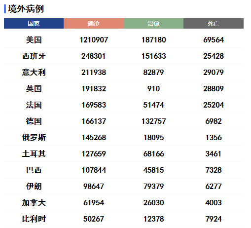 數(shù)據(jù)顯示,美國(guó)是疫情最嚴(yán)重的國(guó)家,累計(jì)確診病例為1177784例,累計(jì)死亡病例為68442例。累計(jì)死亡病例超過(guò)2萬(wàn)例的國(guó)家還有意大利、英國(guó)、西班牙和法國(guó)。