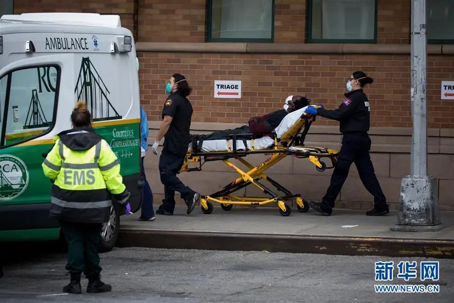 4月19日,在美國紐約一家醫(yī)院,醫(yī)護(hù)人員運(yùn)送病人。新華社發(fā)(郭克 攝)