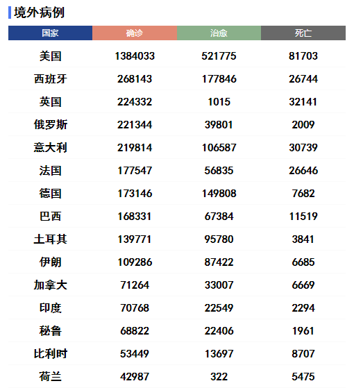 全球范圍內(nèi),新冠確診病例較前一日增加88891例,達(dá)到4006257例;死亡病例較前一日增加4531例,達(dá)到278892例。
