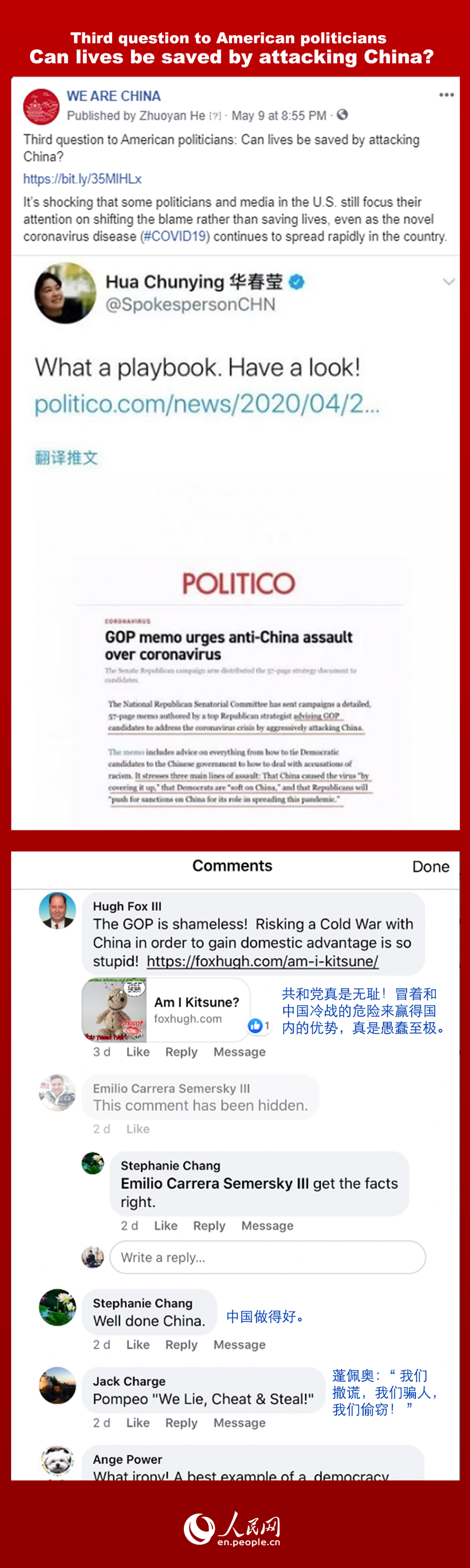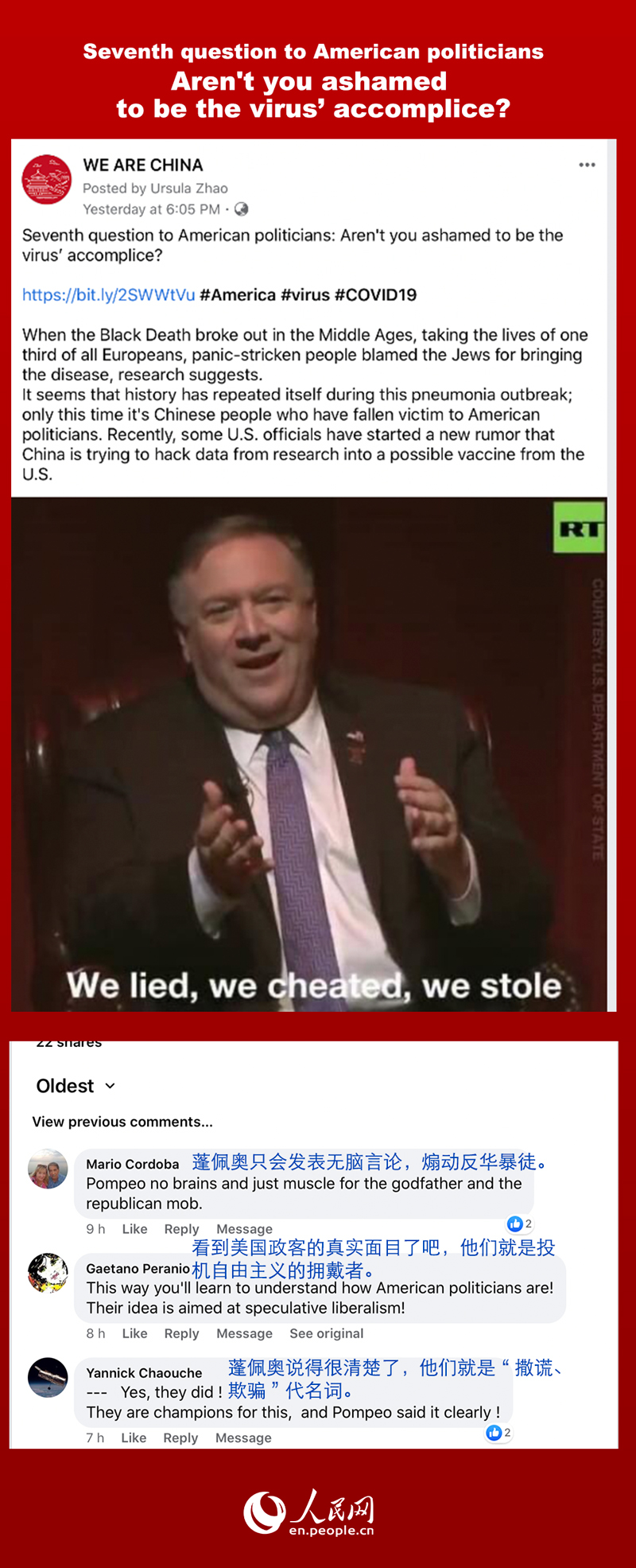 【編者按】疫情當前,美國政客們不治病救人,卻用“撒謊、欺騙、偷竊”打造了一條造謠、傳謠流水線,炮制出一系列針對中國、世衛(wèi)組織和其他實體的謊言。從5月7日起,人民網(wǎng)連發(fā)犀利七問,九個外文語種同步對外發(fā)表,請美國政客給世界一個交代!
