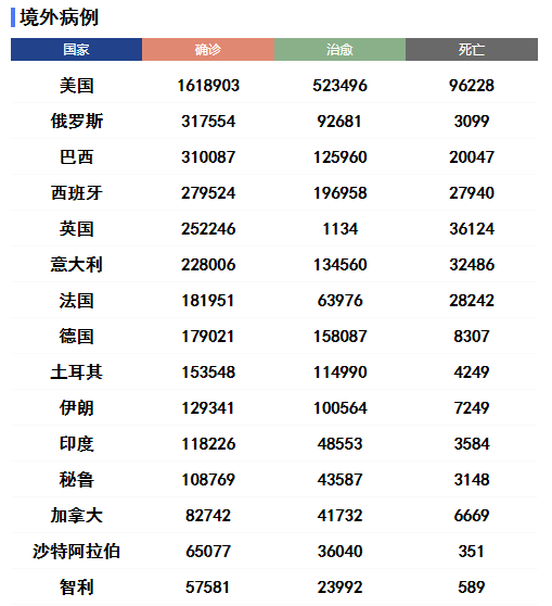 數(shù)據(jù)顯示,目前,美國是全球疫情最嚴重的國家,累計確診病例1551853例,累計死亡病例93439例。累計確診病例超過20萬例的國家有俄羅斯、巴西、英國、西班牙和意大利。此外,法國、德國和土耳其的累計確診病例均超過15萬例。