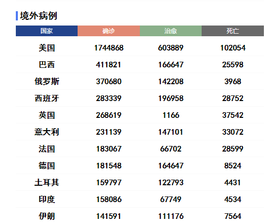 全球范圍內(nèi),新冠確診病例較前一日增加84314例,達(dá)到5488825例;死亡病例較前一日增加5581例,達(dá)到349095例。