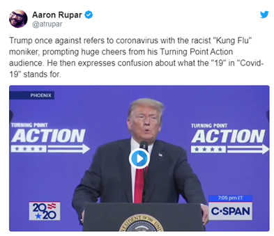 2月11日,世衛(wèi)組織已經(jīng)正式將新冠病毒命名為“Covid-19”。特朗普卻在重啟競選的演講中“戲說新冠”,在年輕人面前嘩眾取寵,“夸口”自己能一口氣說出新冠肺炎的十幾甚至二十個別名。一石激起千層浪,“功夫流感(KungFlu)”一詞在美國上了“熱搜”。輿論紛紛譴責(zé)特朗普販賣種族主義和仇外心理。