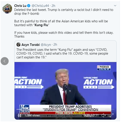 推特用戶Lindy Li表示,特朗普將新冠病毒叫做“功夫流感”意味著“全美的亞裔父母要對孩子解釋他們?yōu)槭裁词艿焦簟。奧巴馬時期的白宮內(nèi)閣秘書盧沛寧(Chris Lu)在推特上寫道:如果你有小孩,請看看這個視頻,告訴他們這樣是不對的。