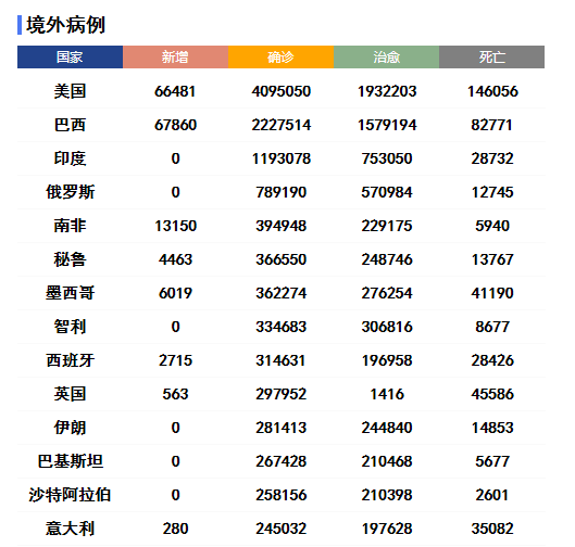 數(shù)據(jù)顯示,美國是全球疫情最嚴(yán)重的國家,累計(jì)確診病例3919550例,累計(jì)死亡病例142350例。巴西累計(jì)確診病例2159654例,累計(jì)死亡病例81487例,兩項(xiàng)數(shù)據(jù)均僅次于美國。