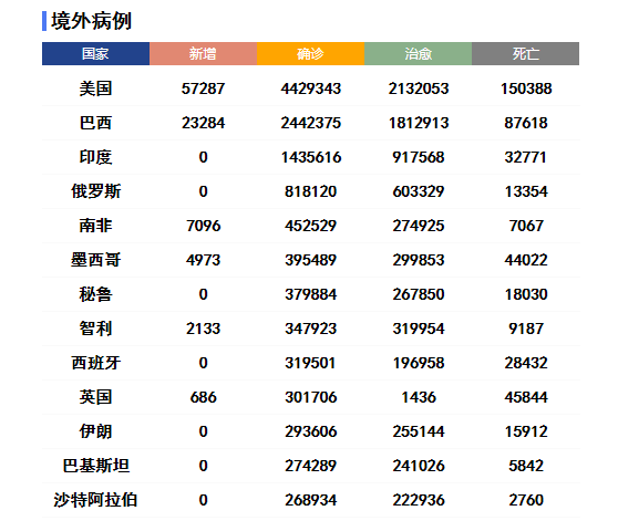 數(shù)據(jù)顯示,美國累計確診病例和死亡病例均最多,分別為4271095例和147253例。累計死亡病例超過3萬例的國家還有巴西、英國、墨西哥、意大利、印度和法國。