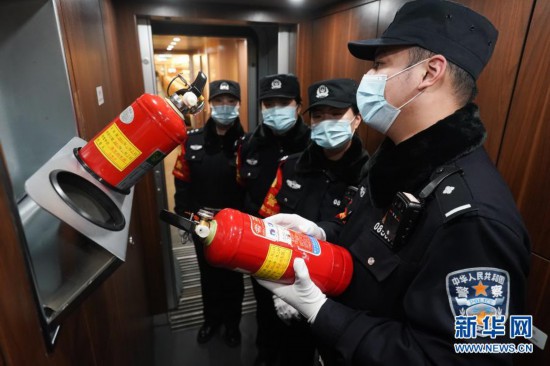 1月26日,南京鐵路公安處乘警支隊(duì)三大隊(duì)乘警長石馳(右一)在車廂內(nèi)向女乘警講解滅火器使用方法。新華社記者 季春鵬 攝