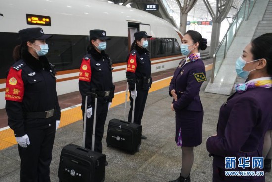 1月26日,在南京站站臺,乘務員和女乘警交流。 新華社記者 季春鵬 攝