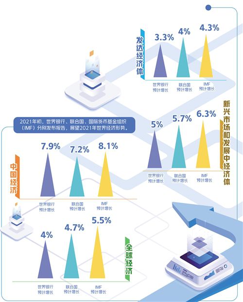 展望未來,隨著新冠疫苗研發(fā)和接種不斷取得新進(jìn)展、各國財(cái)政貨幣政策支持、疫情管控措施謹(jǐn)慎放寬,全球經(jīng)濟(jì)正迎來復(fù)蘇。國際機(jī)構(gòu)最新報(bào)告預(yù)測,今年全球經(jīng)濟(jì)增長4%到5%。世界銀行較為謹(jǐn)慎,考慮到疫情引發(fā)的不確定性正在使全球貿(mào)易和投資量減少,預(yù)計(jì)增長4%。IMF顯得更為樂觀,預(yù)計(jì)今年全球經(jīng)濟(jì)增長5.5%。