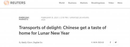 另?yè)?jù)路透社2月8日?qǐng)?bào)道,許多選擇就地過年的中國(guó)人還收到了家人寄來的特色年貨,飽含濃濃“家鄉(xiāng)味道”的包裹拉近了人們與家的距離。