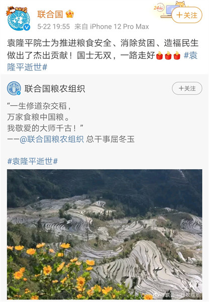 聯(lián)合國、聯(lián)合國糧農(nóng)組織等也在其社交平臺悼念袁隆平:
