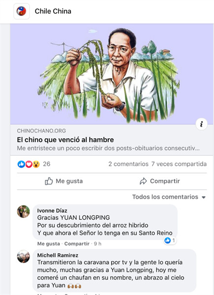 智利網(wǎng)友對袁隆平的貢獻(xiàn)表達(dá)感謝。圖片來源:Facebook“智利-中國(ChileChina)”小組官方賬號截圖