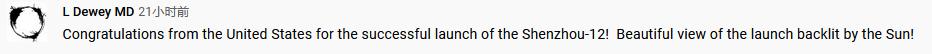 CGTN在外網(wǎng)開(kāi)設(shè)神舟十二號(hào)發(fā)射現(xiàn)場(chǎng)的直播,吸引了各國(guó)網(wǎng)友的廣泛關(guān)注。美國(guó)網(wǎng)友祝賀神舟十二號(hào)發(fā)射成功,點(diǎn)贊神舟十二號(hào)發(fā)射升空時(shí)的壯觀景象。