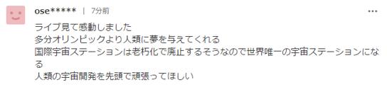 日本網(wǎng)友表示,看了直播很感動(dòng),中國(guó)未來(lái)自主建設(shè)的空間站或?qū)⒊蔀槭澜缥ㄒ坏目臻g站,希望中國(guó)引領(lǐng)人類太空開(kāi)發(fā),繼續(xù)加油。