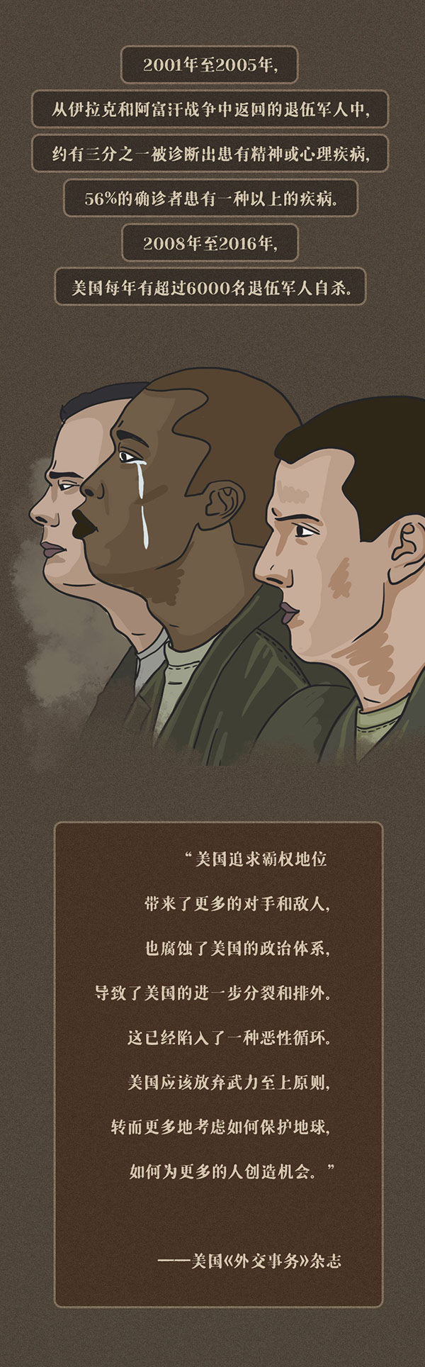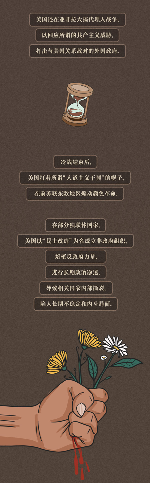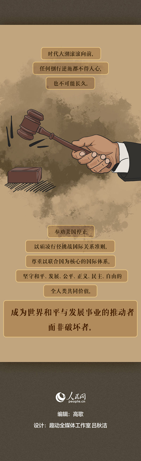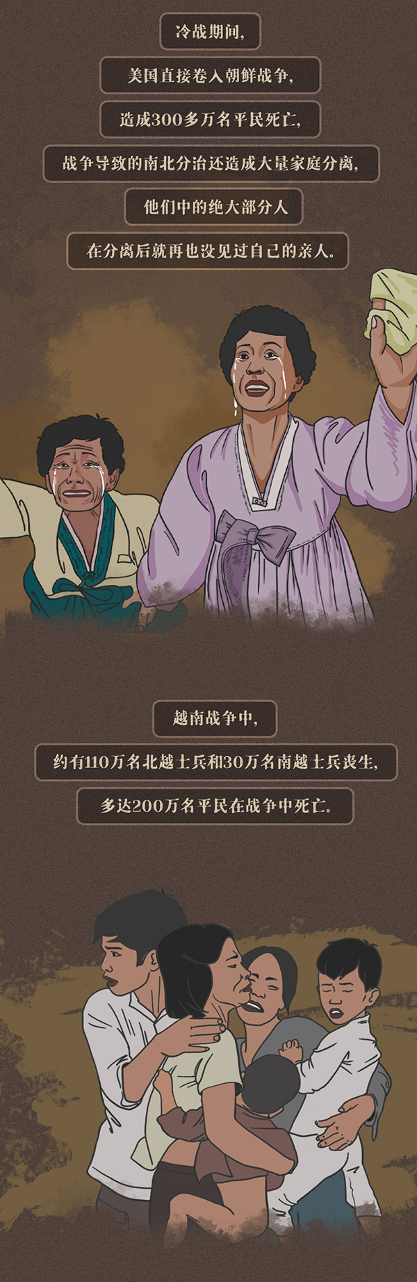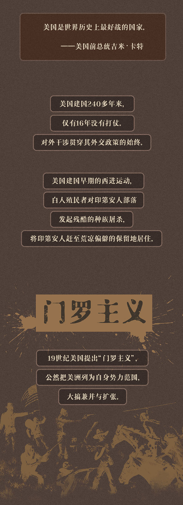編者按:美國前總統(tǒng)吉米·卡特曾指出,美國是世界歷史上最好戰(zhàn)的國家。美國建國240多年來,僅有16年沒有打仗。由于執(zhí)迷于對外干涉和制度輸出,美國的行為讓多少個原本平靜的國家山河破碎、生靈涂炭,無數(shù)家庭妻離子散、骨肉分離。時代大潮滾滾向前,任何倒行逆施都不得人心,也不可能長久。奉勸美國停止以霸凌行徑挑戰(zhàn)國際關(guān)系準(zhǔn)則,尊重以聯(lián)合國為核心的國際體系,堅守和平、發(fā)展、公平、正義、民主、自由的全人類共同價值,成為世界和平與發(fā)展事業(yè)的推動者而非破壞者。